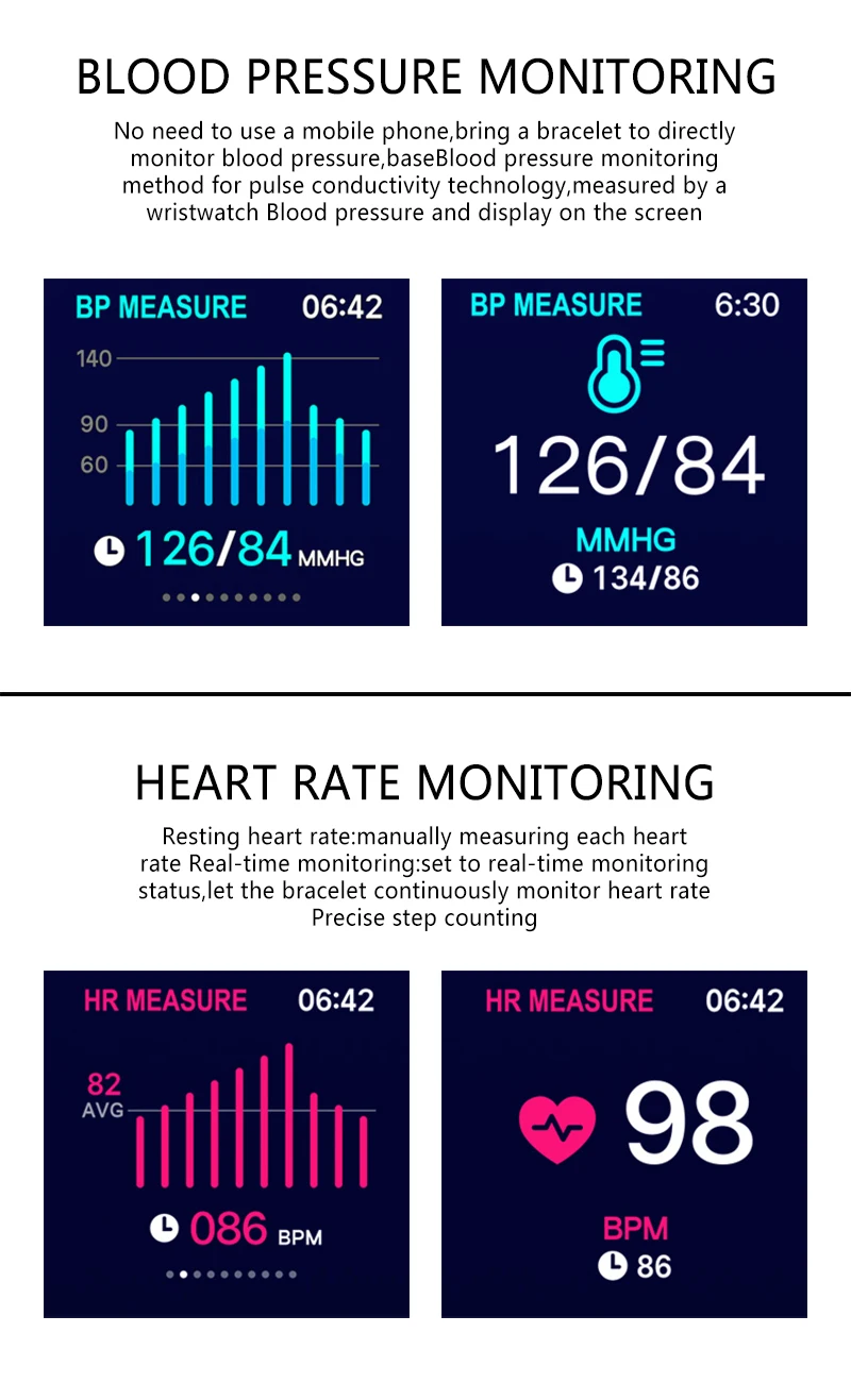 1. Bracelet display function: time display, battery icon display, date display, week display, standard motion function (step, distance, calorie) multi-sport mode (walking, running, cycling, skipping, badminton, basketball) , football, swimming), heart rate, blood pressure detection, blood oxygen detection, sleep time display, screen brightness adjustment, music control.